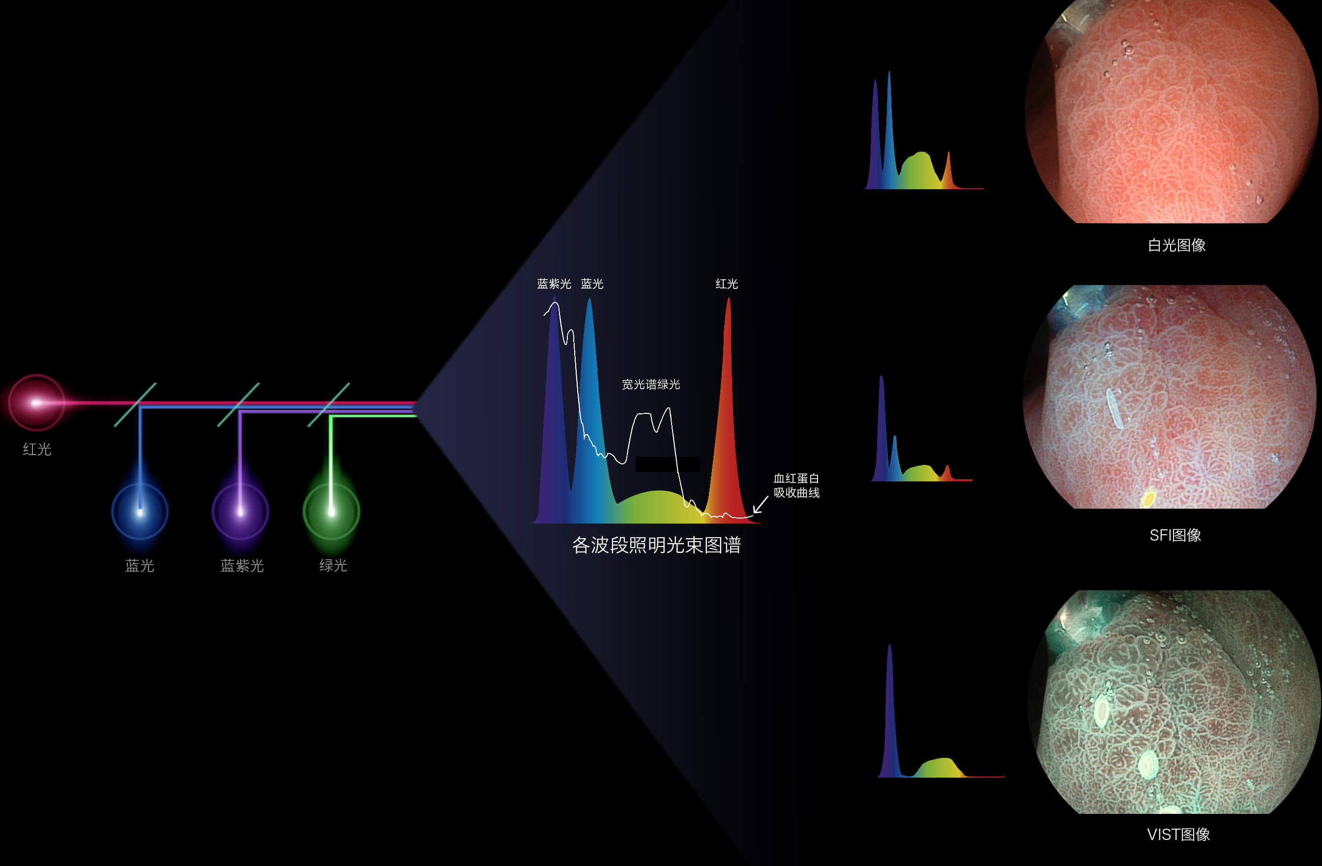 開立新開發(fā)的內(nèi)鏡染色技術(shù),主要是基于多波長LED 光源的開發(fā),VLS-55Q 四波長LED 光源是由四個(gè)不同顏色的LED光按照相應(yīng)照明模式所規(guī)定的特定發(fā)光比例進(jìn)行合束后形成,合束后形成的照明光的光譜由紅光、綠光、藍(lán)光及藍(lán)紫光這四個(gè)不同的波段范圍構(gòu)成。具有更高光譜自由度,通過光譜比例的控制,實(shí)現(xiàn)了聚譜成像技術(shù),英文全稱為“Spectral Focused Imaging, SFI”,縮寫為“SFI”和光電復(fù)合染色成像技術(shù),英文全稱為“Versatile Intelligent Staining Technology, VIST”,縮寫為“VIST”。