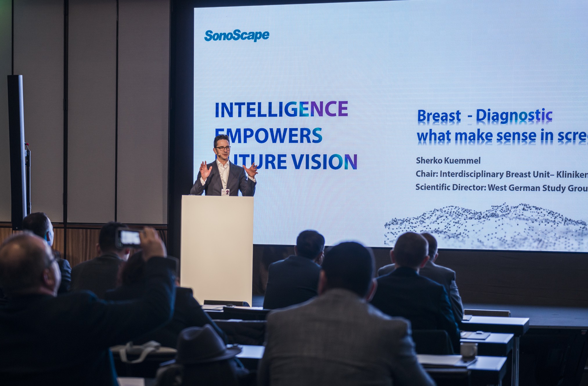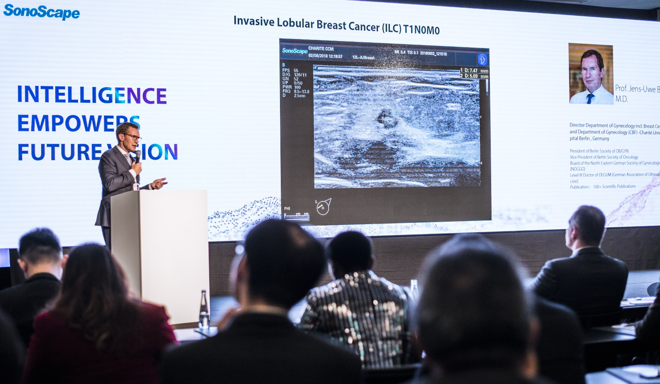 作為Kliniken Essen-Mitte乳腺癌研究項(xiàng)目的負(fù)責(zé)人,另一位乳腺專家Sherko教授則重點(diǎn)分析了超聲對(duì)于乳腺癌篩查重大意義:超聲憑借其快捷、無(wú)創(chuàng)、簡(jiǎn)便等特點(diǎn),已經(jīng)成為目前乳腺癌篩查主要手段,其檢查結(jié)果很大程度上將會(huì)影響后續(xù)的診療措施的制定。但超聲影像下乳腺可疑病灶形態(tài)多樣,對(duì)于臨床鑒別存在一定的難度,而開(kāi)立醫(yī)療自主研發(fā)的S-Breast技術(shù)可以自動(dòng)顯示乳腺可以病變邊界及特征,初步識(shí)別病變的良惡性,輔助醫(yī)生進(jìn)行診斷,給臨床工作帶來(lái)了很大便捷。