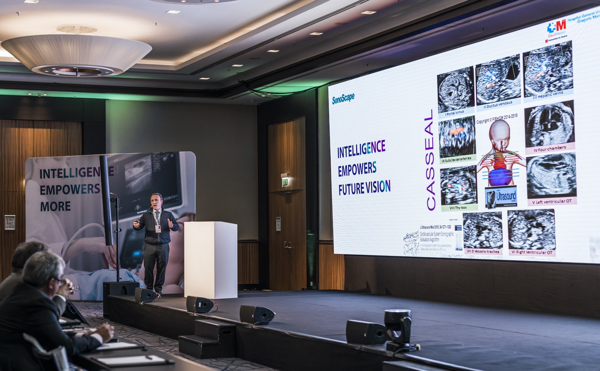 由馬德里Gregorio Marañón醫(yī)院婦產(chǎn)科主任,ALEESCA繼續(xù)教育平臺(tái)的創(chuàng)始人Juan Luis教授為現(xiàn)場(chǎng)參會(huì)人員解讀了血管系統(tǒng)超聲評(píng)價(jià)算法(CASSEAL)在妊娠中期掃描中對(duì)胎兒心血管的應(yīng)用方法。借助開(kāi)立超聲和CASSEAL方法,醫(yī)生可以在B模式下從9個(gè)不同的軸向視圖對(duì)胎兒心臟進(jìn)行準(zhǔn)確的可視化和評(píng)估,能夠?yàn)榕R床醫(yī)生對(duì)產(chǎn)前篩查提供更多的幫助。