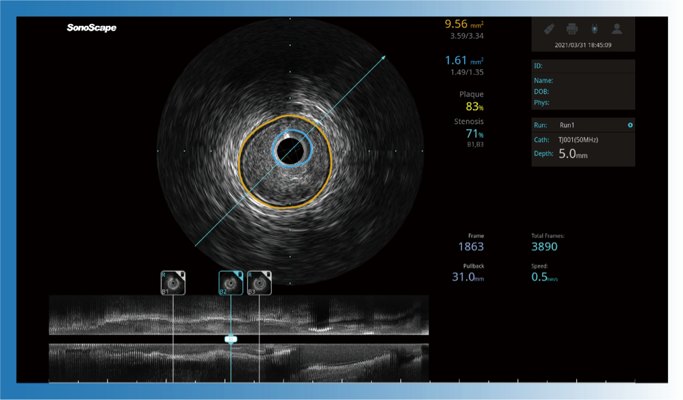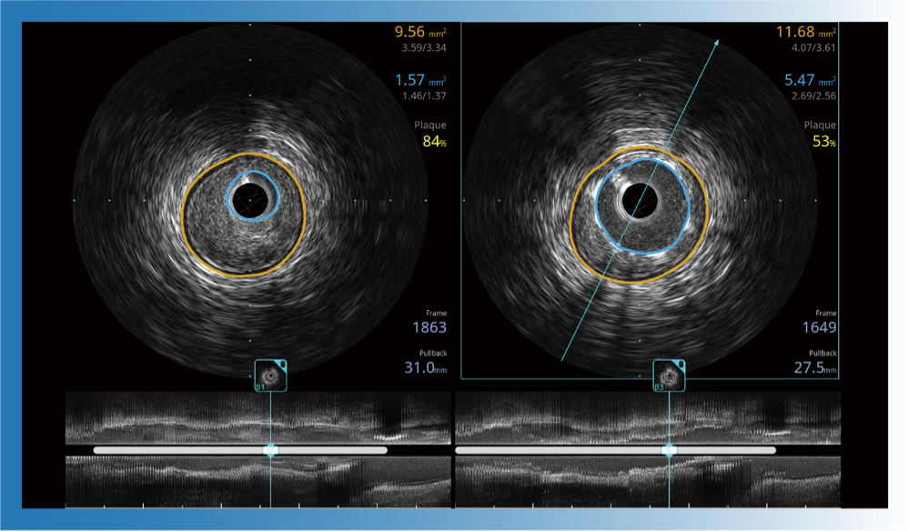 血管內(nèi)超聲(IVUS) 通過(guò)對(duì)病變程度、性質(zhì)和累及范圍的精確判斷,可幫助選擇治療策略和方法,指導(dǎo)介入治療過(guò)程,能夠降低主要不良心血管事件,改善預(yù)后,在復(fù)雜病變介入治療中用于指導(dǎo)支架置入的優(yōu)勢(shì)更為明顯。血管內(nèi)超聲(IVUS)已成為精準(zhǔn)心血管介入治療的“金標(biāo)準(zhǔn)”。