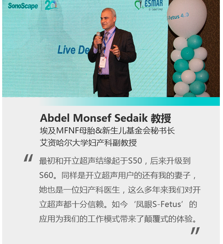 來(lái)自艾資哈爾大學(xué)的Abdel Monsef Sedaik教授是埃及知名的婦產(chǎn)科專家,作為開立超聲的用戶會(huì)議上分享了“鳳眼S-Fetus”的使用體驗(yàn),表示開立超聲的智能功能未來(lái)在埃及的產(chǎn)前超聲檢查領(lǐng)域?qū)?huì)起到重要意義。