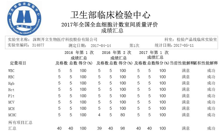 近日,國家衛(wèi)生部臨床檢驗中心公布了《2017年全國全血細胞計數(shù)室間質(zhì)量評價活動》結(jié)果報告。開立醫(yī)療以全部滿分的結(jié)果通過了此次室間質(zhì)評。