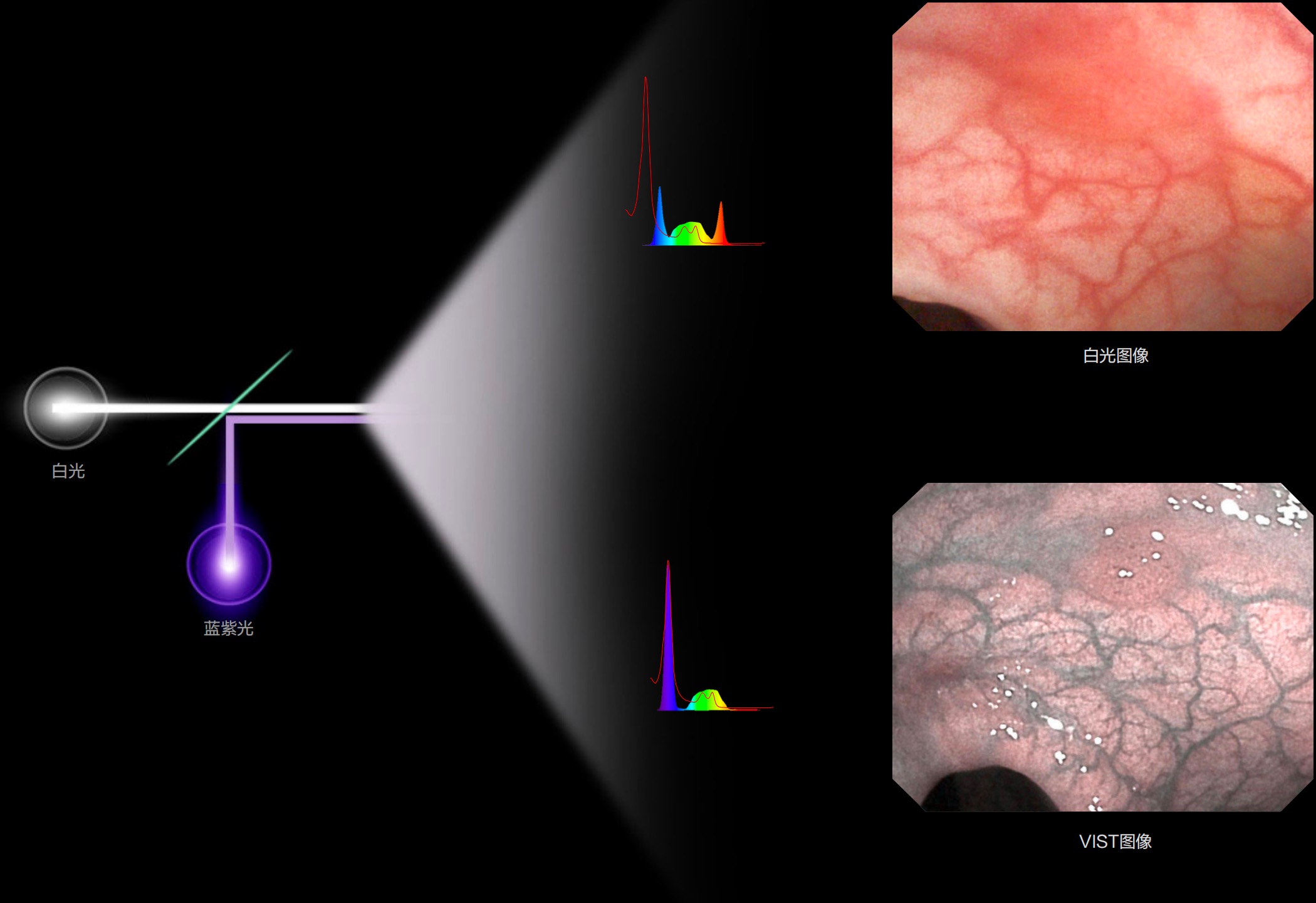 利用了血紅蛋白在不同波長吸收下系數(shù)不同的原理,設(shè)計的一種光學域濾波和數(shù)字域濾波結(jié)合的染色技術(shù),既保證了圖像亮度,又可增強黏膜血管的對比度,充分凸顯早期病變的細微結(jié)構(gòu)變化,為臨床疾病的觀察診斷提供更豐富的參考信息。